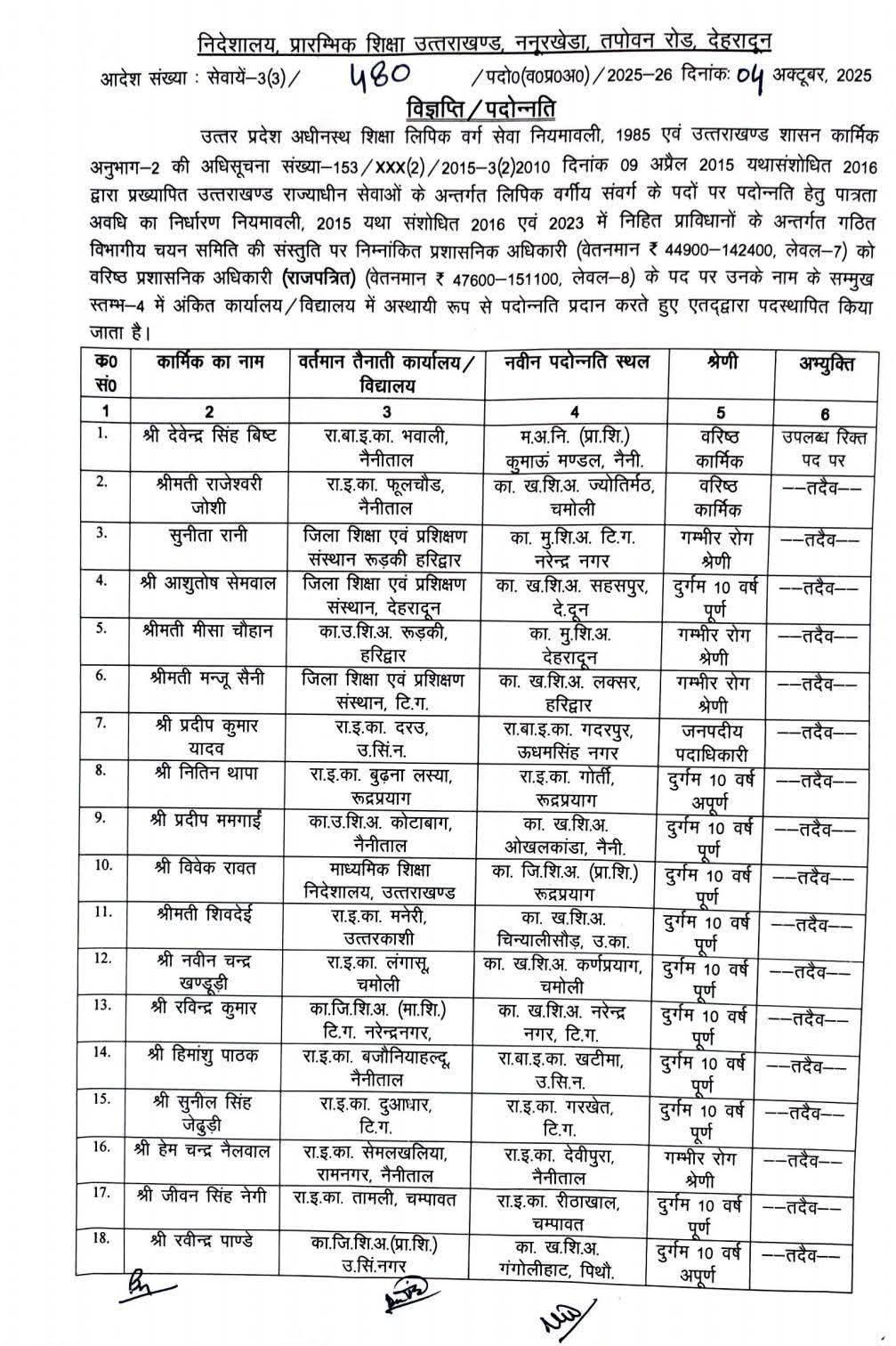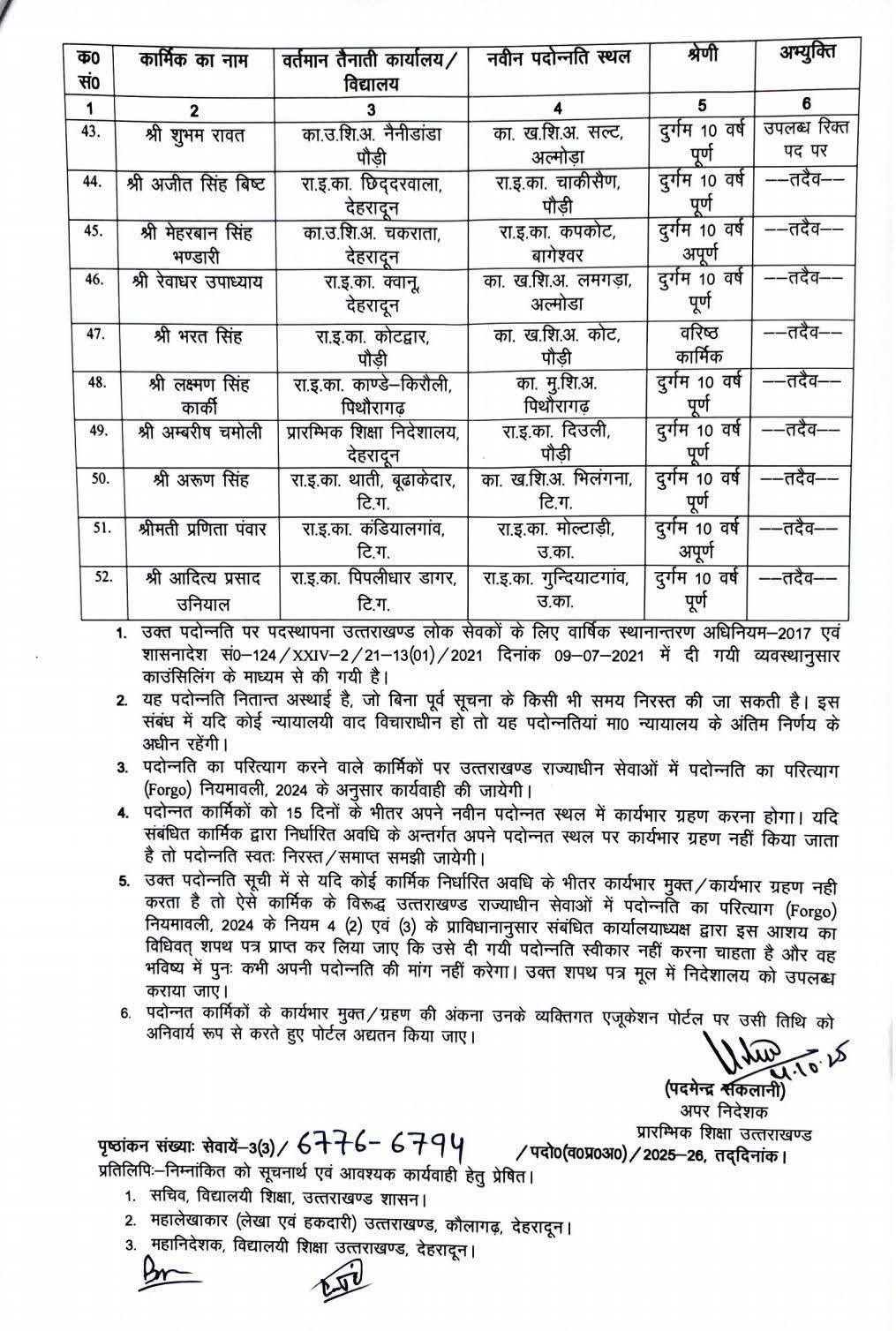 देहरादून। शिक्षा विभाग में 52 प्रशासनिक अधिकारियों (वेतनमान 44900-142400, लेवल-7) को वरिष्ठ प्रशासनिक अधिकारी (राजपत्रित) (वेतनमान 47600-151100, लेवल-8) के पद पर पदोन्नति देने के साथ ही नए स्थलों पर तैनाती दी गई है।