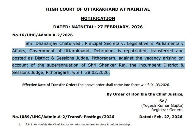 उत्तराखण्डधनंजय चतुर्वेदी होंगे पिथौरागढ़ के नए जिला एवं सत्र न्यायाधीश Pavansutexpress8 hours ago01 mins देहरादून। प्रमुख सचिव विधायी एवं संसदीय कार्य धनंजय चतुर्वेदी का तबादला पिथौरागढ़ के जिला एवं सत्र न्यायाधीश के पद पर किया गया है। वर्तमान में पिथौरागढ़ में जिला एवं सत्र न्यायाधीश शंकर राज कल 28 फरवरी को सेवानिवृत्त हो रहे हैं। Post navigation Previous: ध्यानी कार्यमुक्त, IAS बिष्ट को पिटकुल के MD का चार्जNext: उत्तराखंड पुलिस कांस्टेबल भर्ती परीक्षा का रिजल्ट घोषित Leave a Reply Cancel replyYour email address will not be published. Required fields are marked *Comment * Name * Email * Website Save my name, email, and website in this browser for the next time I comment. Δ