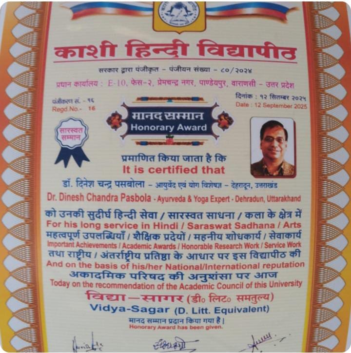 देहरादून। काशी हिन्दी विद्यापीठ, वाराणसी, उत्तर प्रदेश द्वारा डॉ. डीसी पसबोला को उच्च मानद डॉक्टरेट (Higher Honorary – D Litt) के लिए नामित किया है। विद्यापीठ की अकादमिक परिषद की अनुशंसा के पश्चात कुलपति डॉ० संभाजी राजाराम बाविस्कर के अनुमोदन के पश्चात उप कुलपति एवं कार्यक्रम संयोजक डॉ० योगेश त्रेहन द्वारा इस सम्बन्ध में पत्र जारी कर दिया गया था।