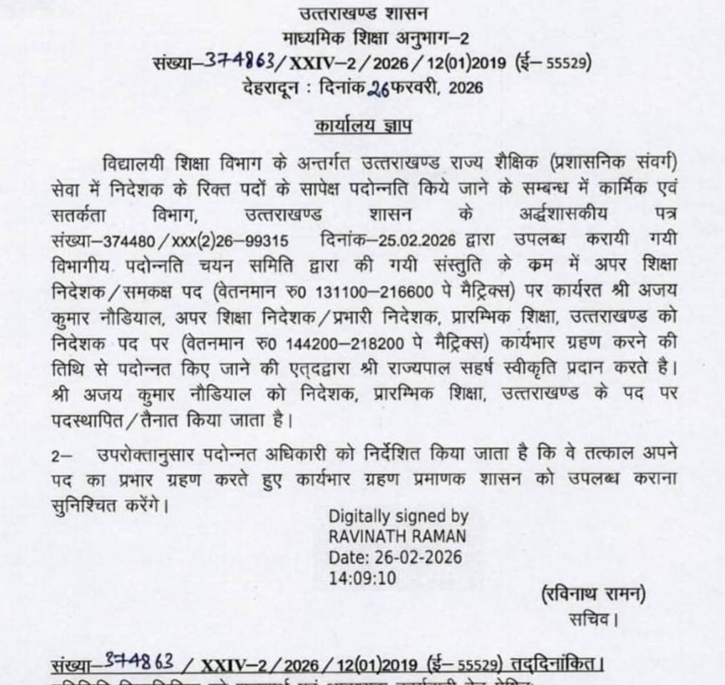 देहरादून। शासन ने विद्यालयी शिक्षा विभाग में अपर शिक्षा निदेशक/प्रभारी निदेशक प्रारंभिक शिक्षा अजय नौडियाल को निदेशक पद पर प्रोन्नत करने के साथ ही 5 संयुक्त निदेशकों मेहरबान सिंह रावत, बृजमोहन सिंह रावत, पदमेन्द्र सकलानी और परमेन्द्र कुमार को अपर निदेशक के पद पर पदोन्नति दी है।