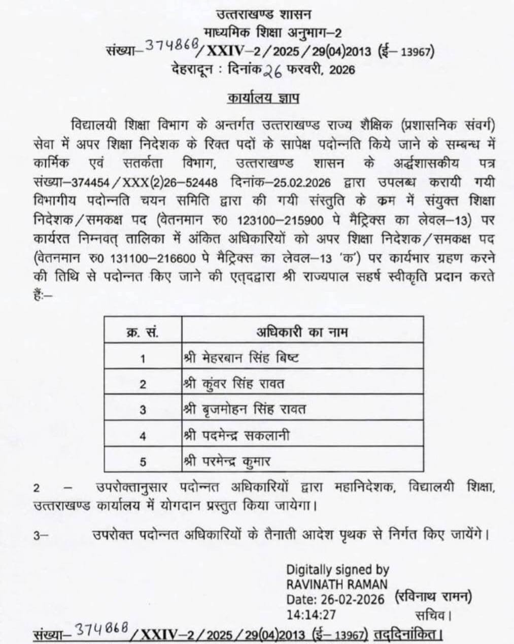 देहरादून। शासन ने विद्यालयी शिक्षा विभाग में अपर शिक्षा निदेशक/प्रभारी निदेशक प्रारंभिक शिक्षा अजय नौडियाल को निदेशक पद पर प्रोन्नत करने के साथ ही 5 संयुक्त निदेशकों मेहरबान सिंह रावत, बृजमोहन सिंह रावत, पदमेन्द्र सकलानी और परमेन्द्र कुमार को अपर निदेशक के पद पर पदोन्नति दी है।