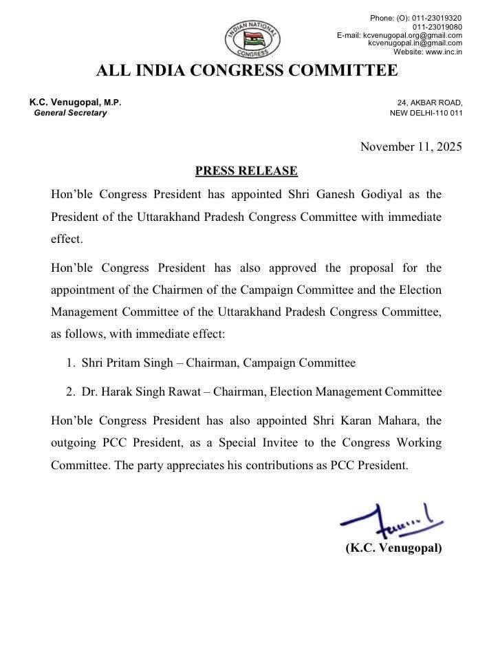 एआईसीसी के महासचिव केसी वेणुगोपाल की ओर से जारी पत्र में निवर्तमान अध्यक्ष करन माहरा को कांग्रेस वर्किग कमेटी में विशेष आमंत्रित सदस्य नियुक्त किया गया है।