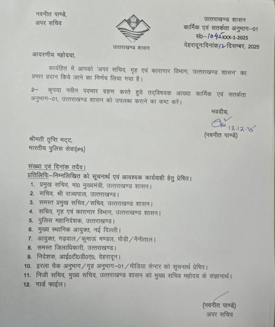 आईपीएस अधिकारी तृप्ति भट्ट को अपर सचिव, गृह एवं कारागार की जिम्मेदारी