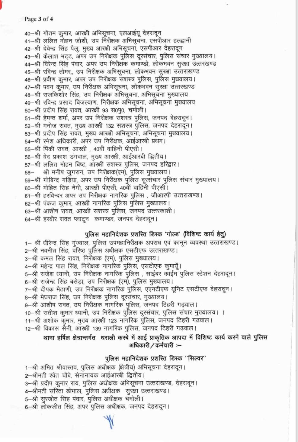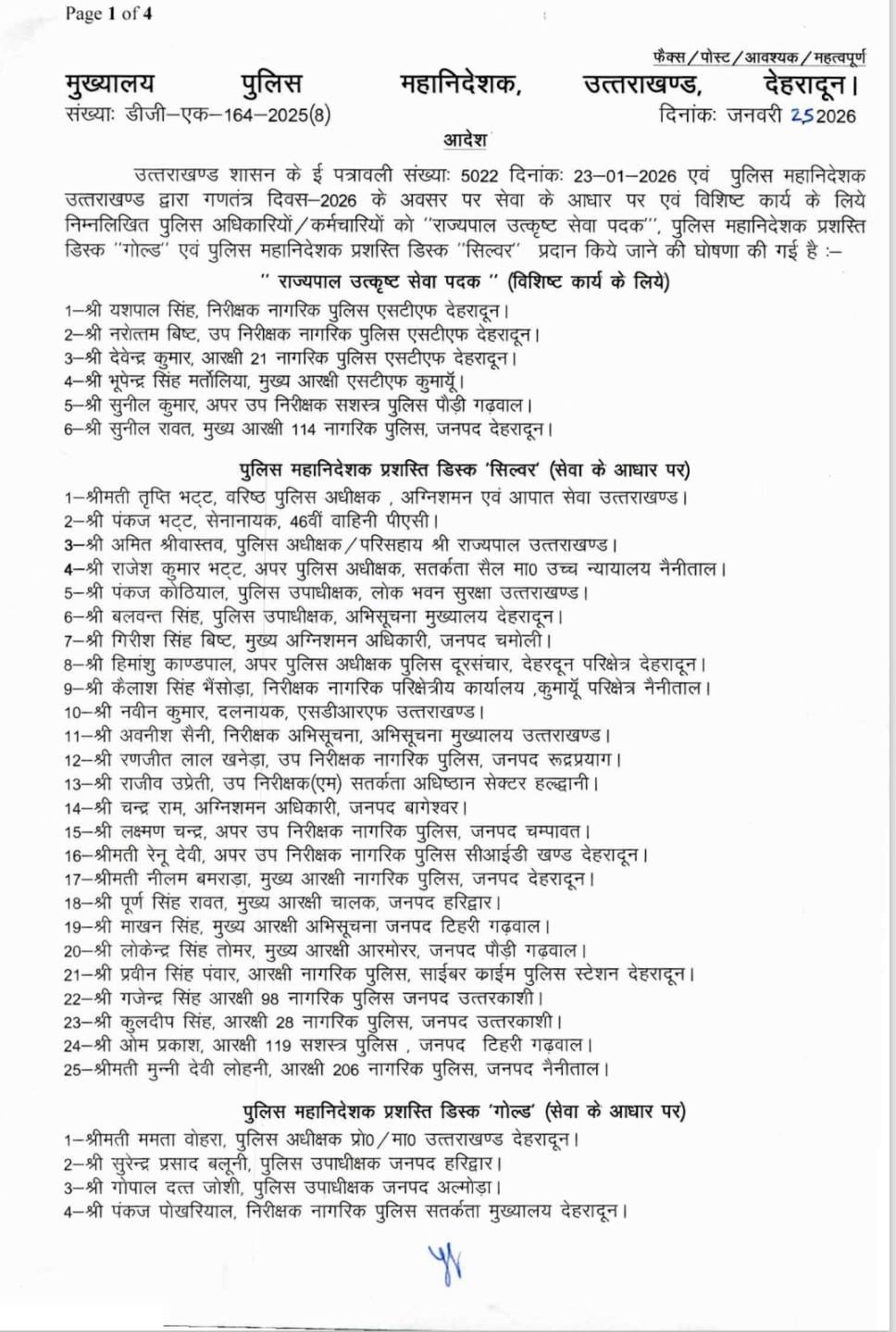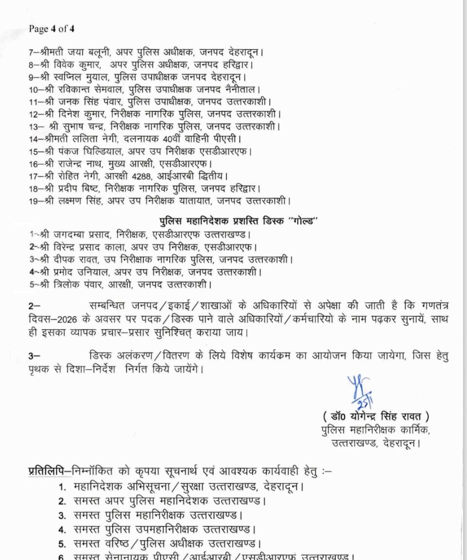देहरादून। पुलिस महानिदेशक ने गणतंत्र दिवस की पूर्व संध्या पर सेवा के आधार पर एवं विशिष्ट कार्य के लिए 5 पुलिस अधिकारियों-कर्मचारियों को राज्यपाल उत्कृष्ट सेवा पदक और 125 को पुलिस महानिदेशक प्रशस्ति डिस्क प्रदान करने की घोषणा की है।