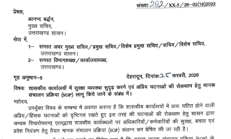 उत्तराखण्डसरकारी कार्यालयों में सुरक्षा व्यवस्था सुदृढ़ करने और अप्रिय घटनाओं की रोकथाम के लिए SOP जारी Pavansutexpress9 hours ago01 mins Home/राजकाज/सरकारी कार्यालयों में सुरक्षा व्यवस्था सुदृढ़ करने और अप्रिय घटनाओं की रोकथाम के लिए SOP जारी राजकाज विभागाध्यक्षों को अपने कार्यालयों में SOP का कड़ाई से पालन करने के निर्देश Post navigation Previous: राजीव नगर के महिला को चापड़ दिखाने वाला युवक गिरफ्तारNext: दून विश्वविद्यालय में ‘थिएटर इन एजुकेशन’ कार्यशाला ने दी नई दिशा: प्रो. सुरेखा डंगवाल Leave a Reply Cancel replyYour email address will not be published. Required fields are marked *Comment * Name * Email * Website Save my name, email, and website in this browser for the next time I comment. Δ