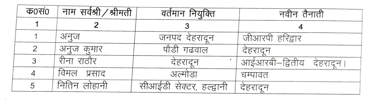 पुलिस मुख्यालय ने 5 पुलिस उपाधीक्षकों का स्थानांतरण भी किया है। स्थानांतरित होने वाले पुलिस उपाधीक्षकों में अनुज, जीआरपी हरिद्वार, अनुज कुमार, देहरादून, रीना राठौर, आईआरबी-द्वितीय देहरादून और विमल प्रसाद, चम्पावत और नितिन लोहानी, देहरादून के नाम शामिल हैं।