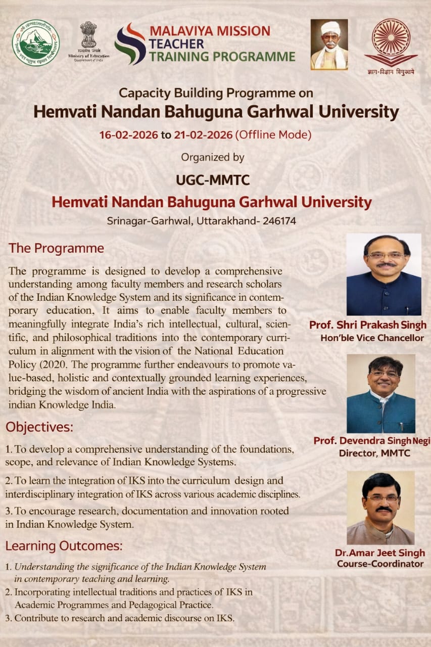 श्रीनगर। हेमवती नंदन बहुगुणा गढ़वाल विश्वविद्यालय के यूजीसी-मालवीय मिशन टीचर्स ट्रेनिंग सेंटर (एमएमटीसी) की ओर से भारतीय ज्ञान परम्परा के पाठ्यक्रम में प्रभावी एकीकरण के उद्देश्य से 16 फरवरी से विशेष क्षमता निर्माण कार्यक्रम आयोजित किया जायेगा।