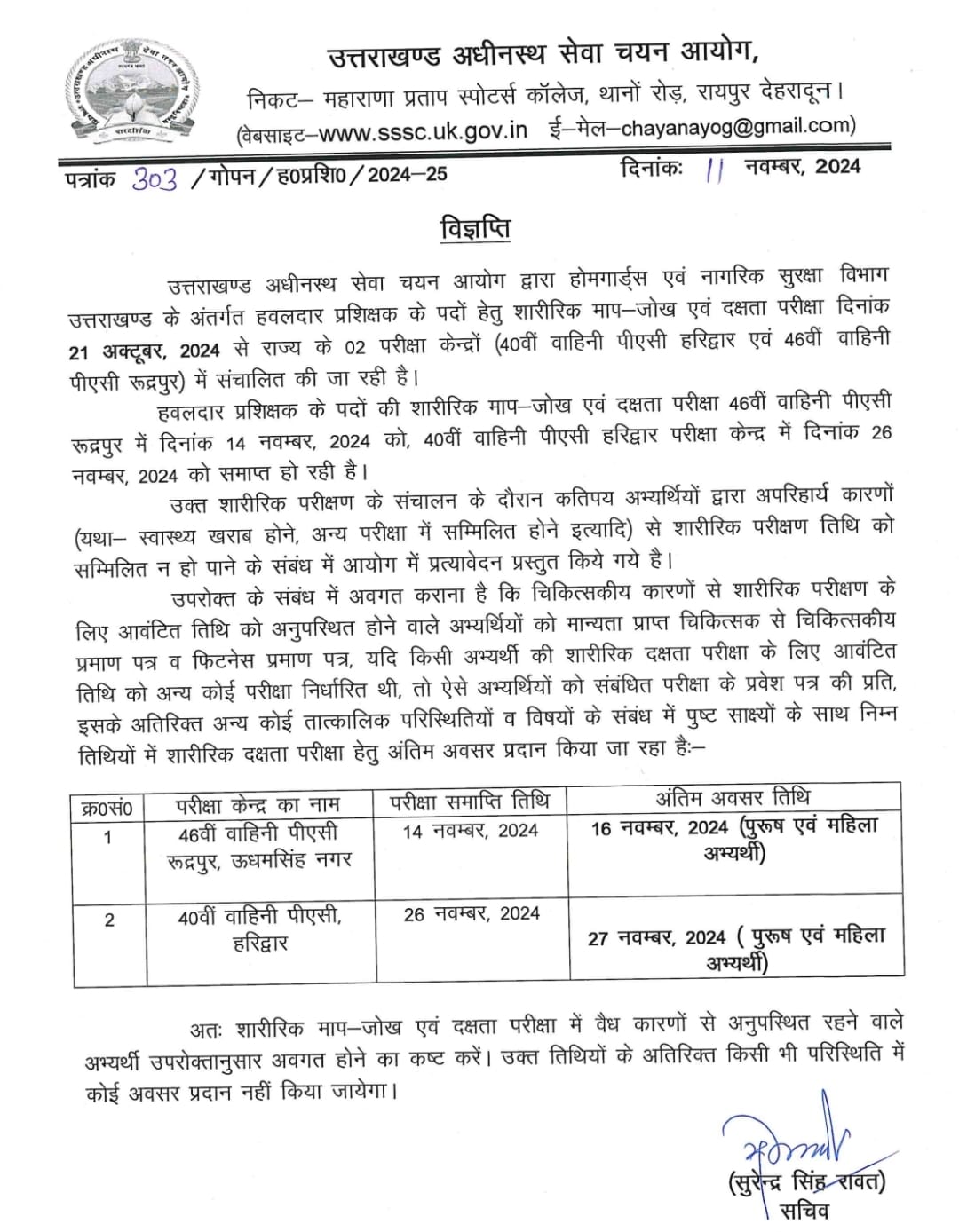 देहरादून। उत्तराखण्ड अधीनस्थ सेवा चयन आयोग द्वारा इन दिनों राज्य के दो परीक्षा केन्द्रों, 40वीं वाहिनी पीएसी रुद्रपुरएवं 46वीं वाहिनी पीएसी हरिद्वार में होमगार्ड्स एवं नागरिक सुरक्षा विभाग में हवलदार प्रशिक्षक के पदों के लिए शारीरिक माप-जोख एवं दक्षता संचालित की जा रही है, जो क्रमश 14 नवम्बर और 26 नवम्बर, 2024 चल चलेगी।