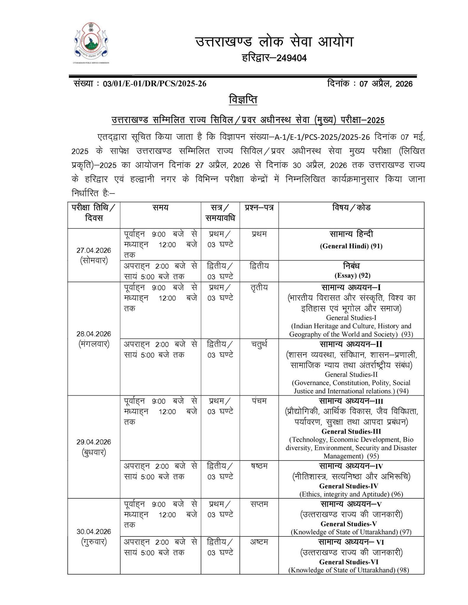 उत्तराखण्डउत्तराखंड PCS मुख्य परीक्षा का शेड्यल जारी Pavansutexpress2 hours ago01 mins देहरादून। उत्तराखंड लोक सेवा आयोग ने उत्तराखंड सम्मिलित राज्य सिविल/प्रवर अधीनस्थ सेवा मुख्य परीक्षा का कार्यक्रम जारी कर दिया है। यह परीक्षा 27 अप्रैल से 30 अप्रैल 2026 तक हरिद्वार और हल्द्वानी में विभिन्न परीक्षा केंद्रों पर आयोजित की जाएगी। Post navigation Previous: जोशीमठ पीजी कॉलेज में अँग्रेजी विभाग परिषद का गठन Leave a Reply Cancel replyYour email address will not be published. Required fields are marked *Comment * Name * Email * Website Save my name, email, and website in this browser for the next time I comment. Δ