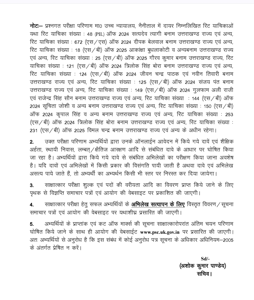 देहरादून। उत्तराखंड लोक सेवा आयोग द्वारा ‘उत्तराखण्ड सम्मिलित राज्य सिविल /प्रवर अधीनस्थ सेवा परीक्षा-2024’ की मुख्य (लिखित) परीक्षा 02 फरवरी, 2025 से 05 फरवरी, 2025 तक एवं सामान्य अध्ययन प्रथम प्रश्नपत्र की पुनः परीक्षा 14 मई, 2025 को सम्पादित की गयी। मुख्य (लिखित) परीक्षा के प्राप्ताकों के आधार पर इन अभ्यर्थियों को पदवार साक्षात्कार परीक्षा हेतु औपबंधिक रूप से सफल घोषित किया गया है।